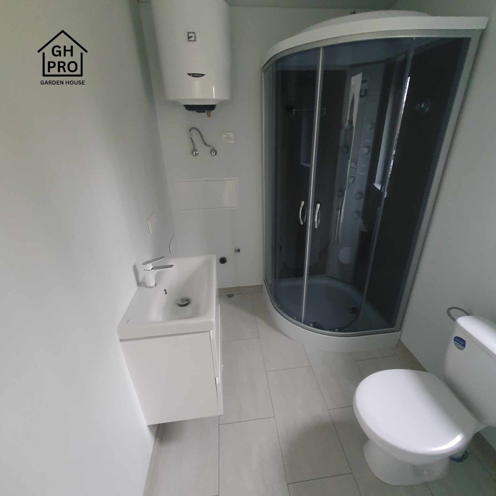 - Complete bathroom with massage shower cabin, WC, washbasin, electric towel dryer.
