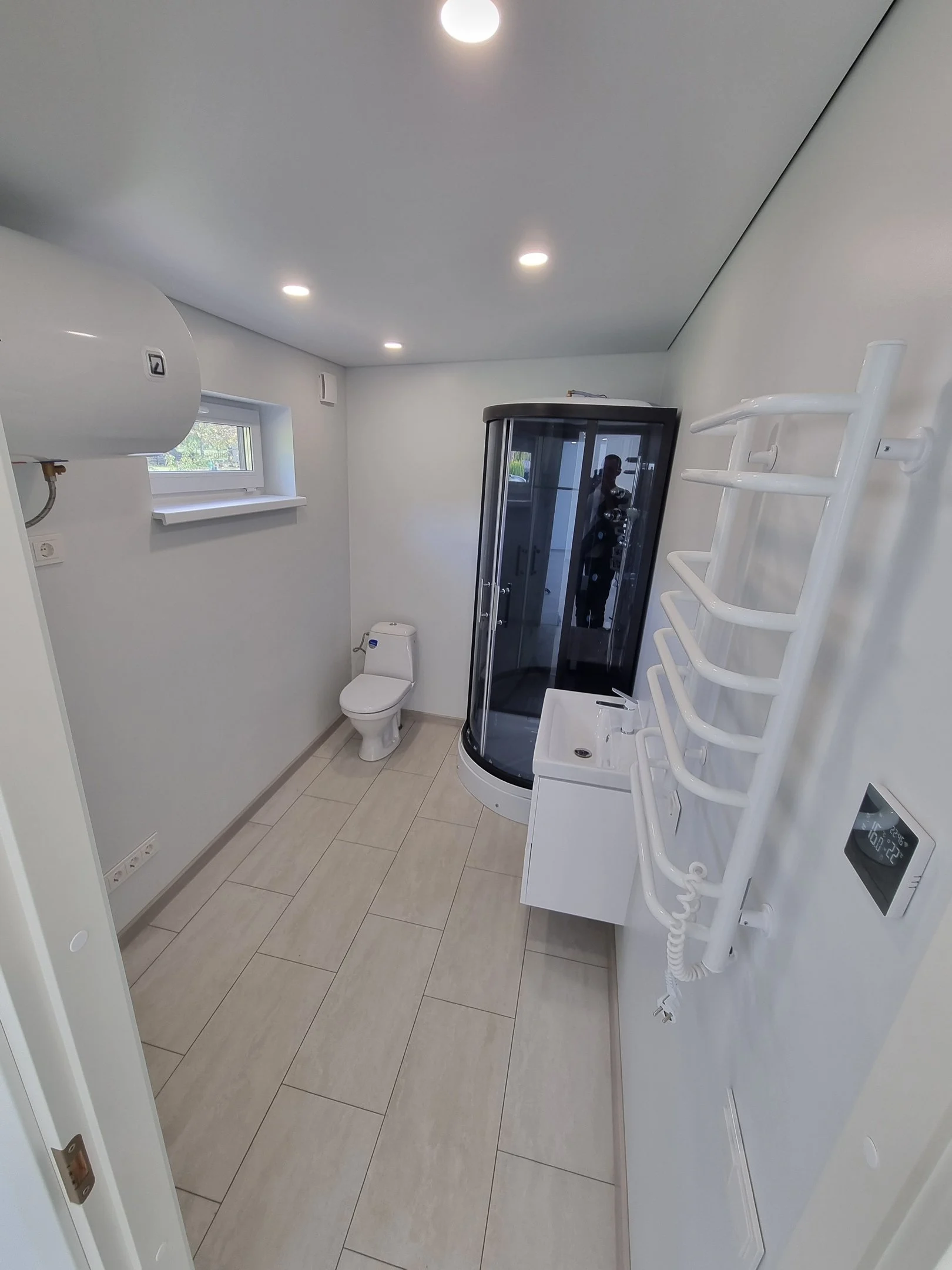 - Complete bathroom with massage shower cabin, WC, washbasin, electric towel dryer.